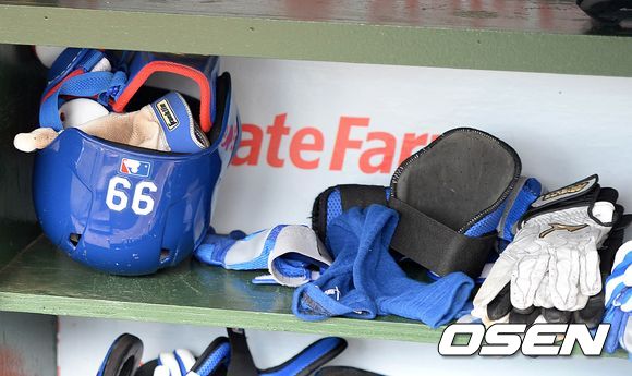 사진은 원정 덕아웃 류현진의 헬멧과 장갑.