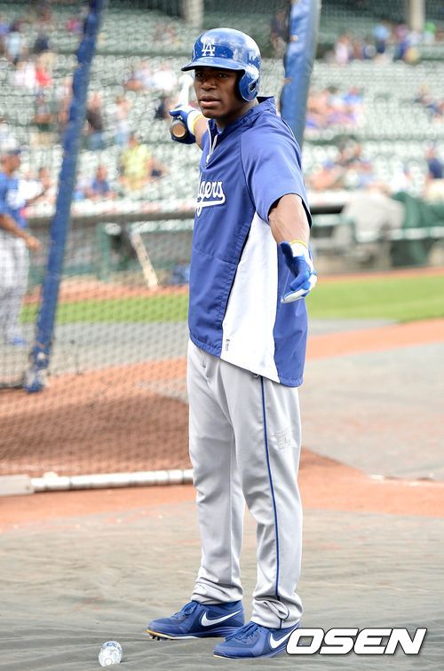 경기에 앞서 다저스 푸이그가 타격 훈련 중 동료와 이야기를 하고 있다.