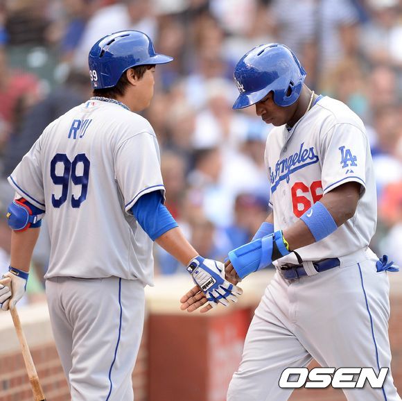 3일(이하 한국시간) 미국 일리노이주 시카고 리글리 필드에서 2013 메이저리그 LA 다저스와 시카고 컵스의 경기 3회초 2사 만루 류현진이 엘리스의 밀어내기 볼넷으로 홈을 밟은 푸이그를 맞이하고 있다.