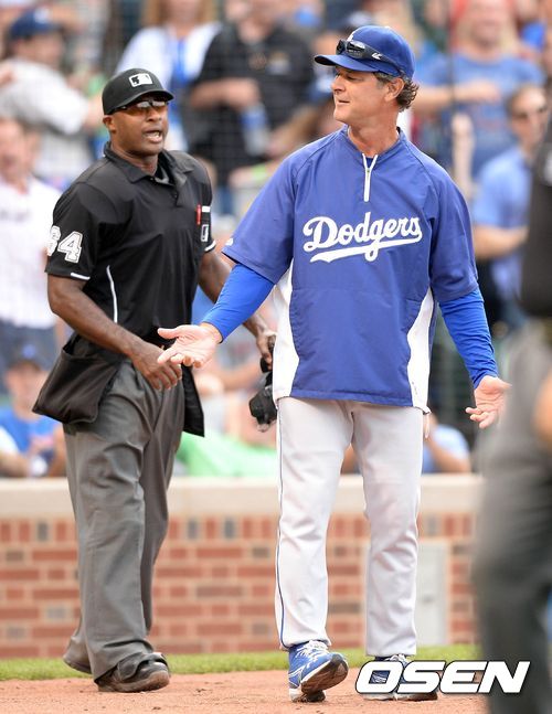 3일(이하 한국시간) 미국 일리노이주 시카고 리글리 필드에서 2013 메이저리그 LA 다저스와 시카고 컵스의 경기 4회초 무사 1루 볼넷을 확신한 엘리스가 스트라이크 아웃을 선언한 구심에게 판정에 어필을 하다 퇴장이 선언됐다. 매팅리 감독이 이에 항의하다 역시 퇴장 선언이 되자 어이없다는 표정을 짓고 있다.