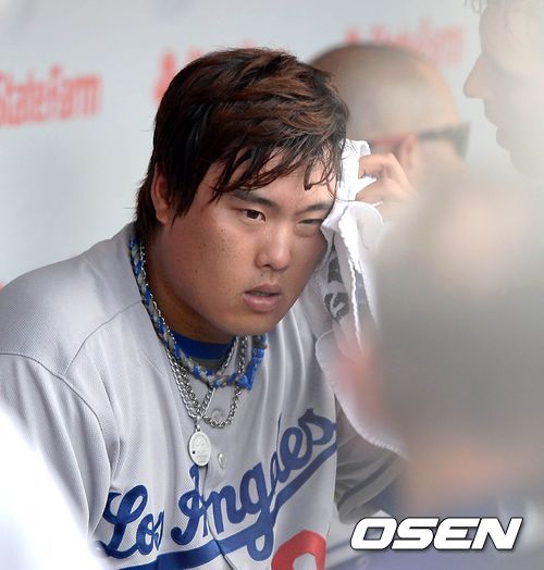 3일(이하 한국시간) 미국 일리노이주 시카고 리글리 필드에서 2013 메이저리그 LA 다저스와 시카고 컵스의 경기 5회까지 2실점 한 류현진이 더그아웃에서 땀을 닦고 있다.