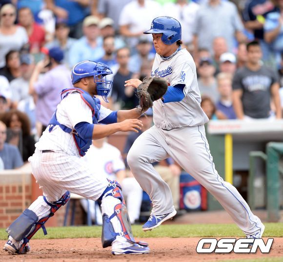 3일(이하 한국시간) 미국 일리노이주 시카고 리글리 필드에서 2013 메이저리그 LA 다저스와 시카고 컵스의 경기 4회초 1사 1,2루 곤살레스의 안타때 류현진이 득점을 올리고 있다.