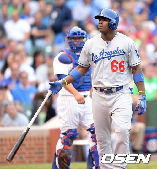 3일(이하 한국시간) 미국 일리노이주 시카고 리글리 필드에서 2013 메이저리그 LA 다저스와 시카고 컵스의 경기 4회초 1사 2,3루 푸이그가 투구에 맞고 1루로 가고 있다.