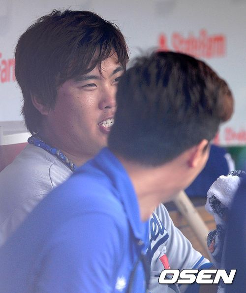 3일(이하 한국시간) 미국 일리노이주 시카고 리글리 필드에서 2013 메이저리그 LA 다저스와 시카고 컵스의 경기 6회말 1사 1,2루에서 마운드를 내려온 다저스 류현진이 덕아웃에서 미소를 지으며 동료와 이야기를 나누고 있다.