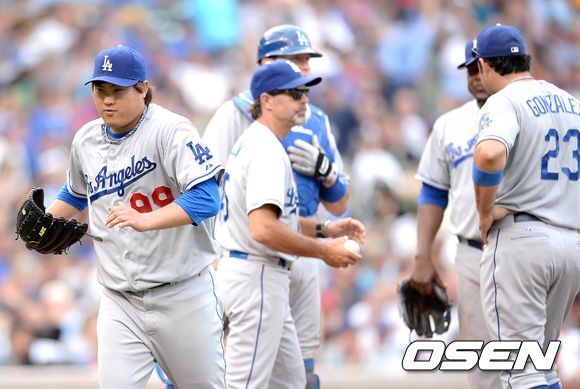 3일(이하 한국시간) 미국 일리노이주 시카고 리글리 필드에서 2013 메이저리그 LA 다저스와 시카고 컵스의 경기 6회말 1사 1,2루에서 다저스 류현진이 마운드를 내려가고 있다.