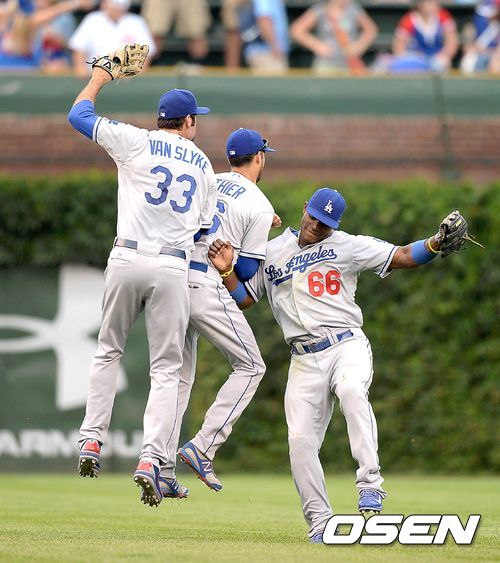 경기 종료 후 다저스 반슬라이크, 이디어, 푸이그가 승리의 기쁨을 나누고 있다. /sunday@osen.co.kr
