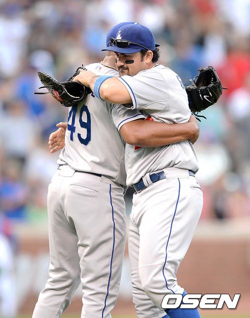 경기 종료 후 다저스 마몰과 곤살레스가 승리의 기쁨을 나누고 있다. /sunday@osen.co.kr