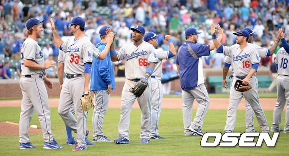 경기 종료 후 다저스 선수들이 승리의 기쁨을 나누고 있다. /sunday@osen.co.kr