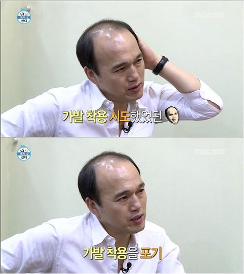 그는 “가발을 썼는데 열이 많아서 부스름과 고름 생겼다”면서 “그 이후로 가발 못 쓰겠다”고 가발을 쓰지 않는다고 고백했다. 김광규는 “빡빡 미는 것은 몰라도 (가발은 못 쓰겠다)”고 고충을 토로했다.