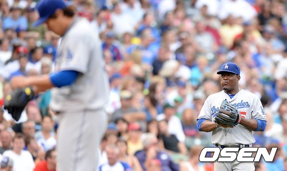 6회말 1사 1루에서 다저스 우리베가 컵스 바니에게 좌전안트를 허용한 류현진을 바라보고 있다. /sunday@osen.co.kr