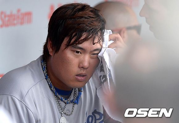 5회말 2사 1,3루에서 다저스 류현진이 컵스 카스트로를 외야플라이로 처리하고 덕아웃에서 땀을 닦고 있다. /sunday@osen.co.kr