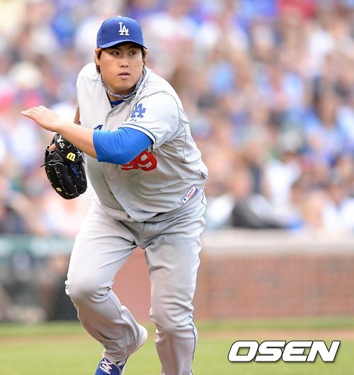 4회말 무사에서 다저스 류현진이 컵스 데헤수스의 타구를 바라보고 있다./sunday@osen.co.kr