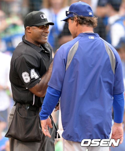 4회초 무사 1루 볼넷을 확신한 엘리스가 스트라이크 아웃을 선언한 구심에게 판정에 어필을 하다 퇴장이 선언됐다. 이에 매팅리 감독이 어필하다 역시 퇴장이 선언됐다./sunday@osen.co.kr