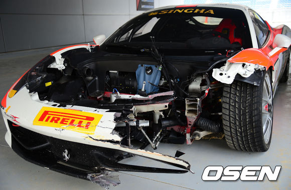 3일 오후 강원도 인제군 인제스피디움에서 열린 '아우디 R8 LMS컵 시리즈'에서 파손된 머신이 주차되어 있다.