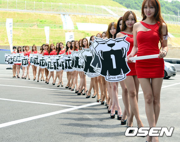 3일 오후 강원도 인제군 인제스피디움에서 열린 '아우디 R8 LMS컵 시리즈'에서 레이싱 모델들이 포토타임을 갖고 있다.