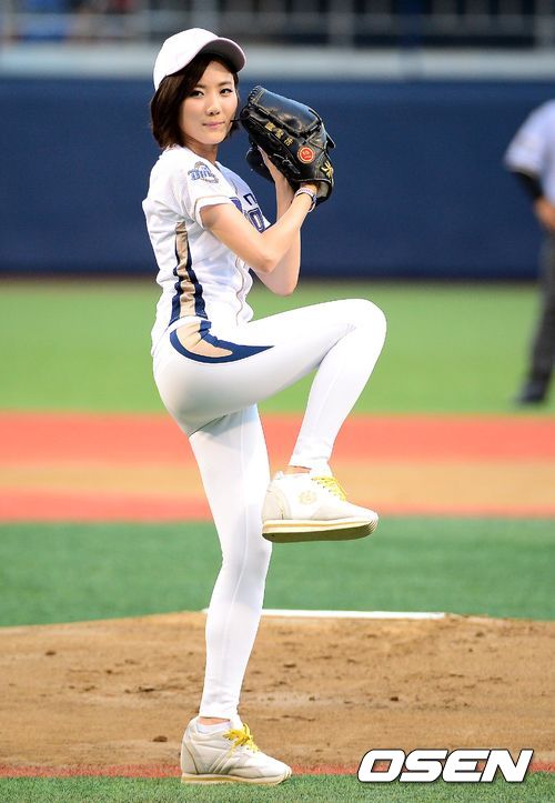경기에 앞서 KBS 김지원 아나운서가 시구를 하고 있다.
