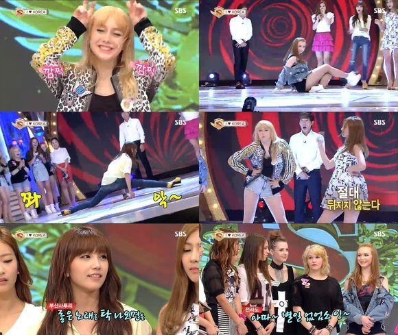 8등신과 금발을 뽐내는 러시아의 커버댄스 그룹 뉴네이션(New Nation)이 그룹 에이핑크와 개인기 대결을 펼쳤다.