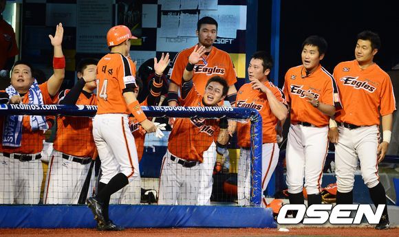 4회초 2사 3루에서 한화 이대수가 엄태용의 적시타에 홈을 밟고 더그아웃에서 동료선수들의 축하를 받고 있다.