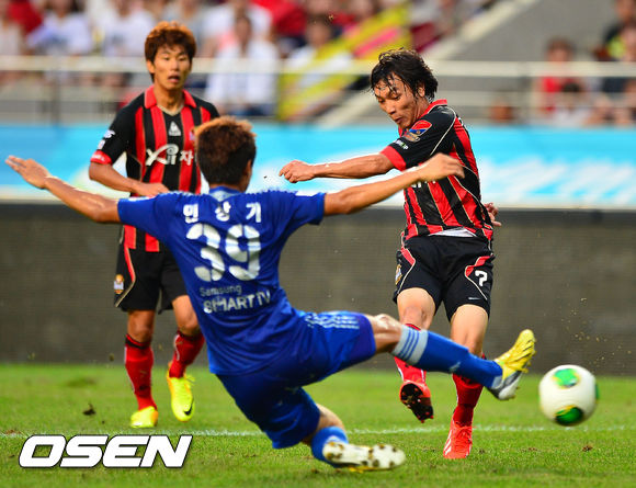 3일 오후 서울월드컵경기장에서 열린 현대오일뱅크 K리그 클래식 2013 FC 서울과 수원 삼성의 경기, 전반 서울 김치우가 강슛을 날리고 있다.