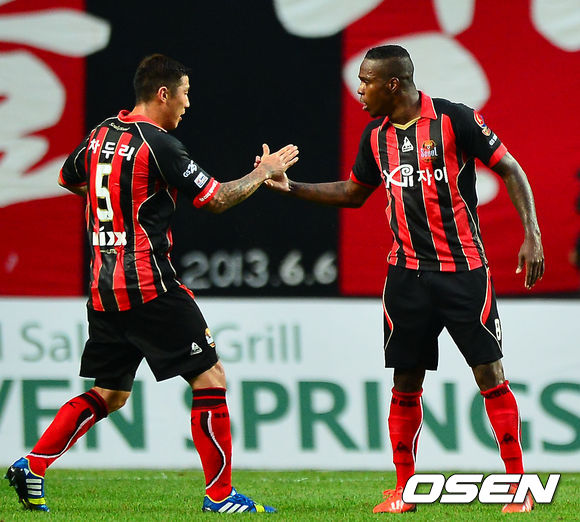3일 오후 서울월드컵경기장에서 열린 현대오일뱅크 K리그 클래식 2013 FC 서울과 수원 삼성의 경기, 전반 서울 아디가 선제골에 성공한 후 차두리와 하이파이브를 하고 있다.