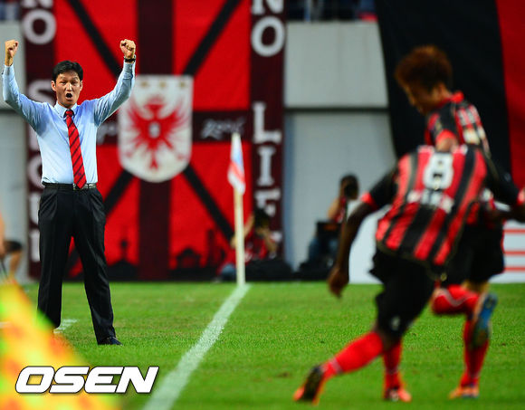 3일 오후 서울월드컵경기장에서 열린 현대오일뱅크 K리그 클래식 2013 FC 서울과 수원 삼성의 경기, 전반 서울 아디가 선제골에 성공하자 최용수 감독이 기뻐하고 있다.