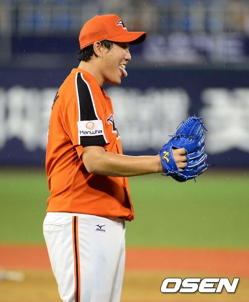 5회말 2사 1,2루에서 한화 송창현이 NC 나성범을 1루수 플라이로 처리하며 미소짓고 있다.