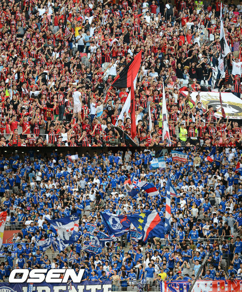 3일 오후 서울월드컵경기장에서 열린 현대오일뱅크 K리그 클래식 2013 FC 서울과 수원 삼성의 경기, 서울과 수원팬들이 열띤응원을 펼치고 있다.