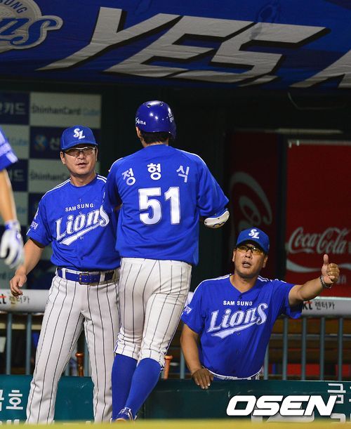 9회초 삼성 공격 1사 주자없는 상황, 1번타자 정형식이 우월 솔로포를 날리고 류중일 감독과 인사를 나누고 있다.