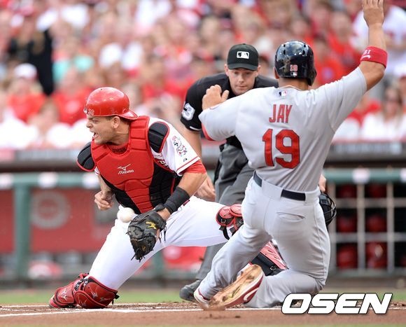 4일(이하 한국시간) 미국 오하이오주 신시내티에 위치한 그레이트 아메리칸 볼파크에서 열린 2013 메이저리그 신시내티 레즈와 세인트루이스 카디널스의 경기, 1회초 무사에서 세인트루이스 벨트란의 중전 적시 2루타 때 1루주자 제이가 홈으로 쇄도해 세이프 되고 있다.
