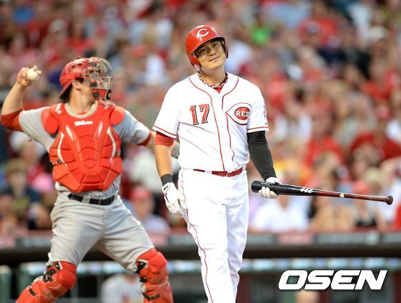 4일(이하 한국시간) 미국 오하이오주 신시내티에 위치한 그레이트 아메리칸 볼파크에서 열린 2013 메이저리그 신시내티 레즈와 세인트루이스 카디널스의 경기, 5말 무사에서 신시내티 추신수가 삼진으로 물러나며 아쉬워하고 있다.