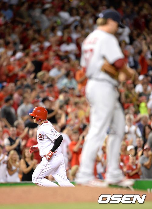 4일(이하 한국시간) 미국 오하이오주 신시내티에 위치한 그레이트 아메리칸 볼파크에서 열린 2013 메이저리그 신시내티 레즈와 세인트루이스 카디널스의 경기, 8회말 무사 1루에서 신시내티 추신수가 우월 투런 홈런을 치고 그라운드를 돌고 있다.