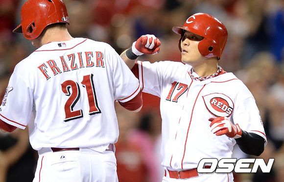 4일(이하 한국시간) 미국 오하이오주 신시내티에 위치한 그레이트 아메리칸 볼파크에서 열린 2013 메이저리그 신시내티 레즈와 세인트루이스 카디널스의 경기, 8회말 무사 1루에서 신시내티 추신수가 우월 투런 홈런을 치고 홈에서 프레이저와 하이파이브를 하고 있다.
