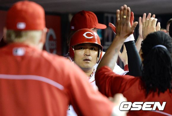 4일(이하 한국시간) 미국 오하이오주 신시내티에 위치한 그레이트 아메리칸 볼파크에서 열린 2013 메이저리그 신시내티 레즈와 세인트루이스 카디널스의 경기, 8회말 무사 1루에서 신시내티 추신수가 우월 투런 홈런을 치고 덕아웃에서 동료들과 하이파이브를 하고 있다.