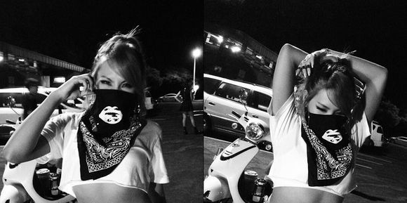 사진 속 씨엘은 검정 손수건을 이용해 입을 가린 뒤 군살 없는 몸매를 자랑하며 기지개를 켜고 있다. 뒤로는 스쿠터 한 대가 놓여져 있어 라이더의 향기를 물씬 내뿜어 눈길을 끈다.