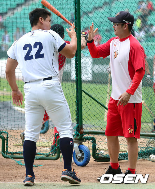 4일 오후 인천 문학구장에서 열리는 '2013 한국야쿠르트 세븐 프로야구' SK 와이번스와 두산 베어스의 경기 시작전 홍성흔과 최경환 코치가 하이파이브를 하고 있다.