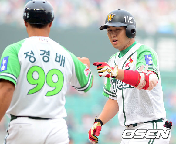 4일 오후 인천 문학구장에서 열린 '2013 한국야쿠르트 세븐 프로야구' SK 와이번스와 두산 베어스의 경기 1회말 1사 3루 최정이 1타점 적시타를 친 후 정경배 코치와 하이파이브를 하고 있다.