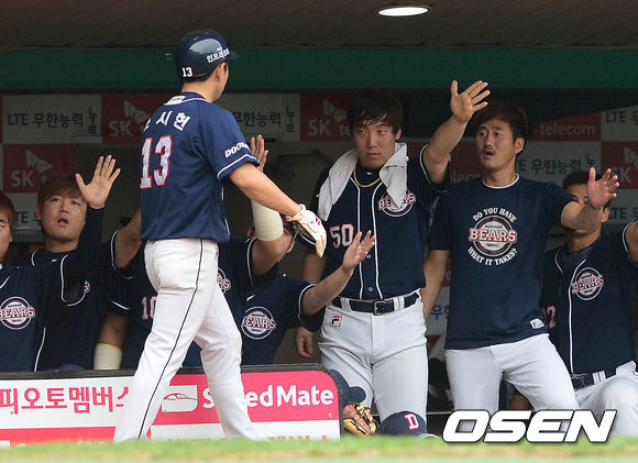 4일 오후 인천 문학구장에서 열린 '2013 한국야쿠르트 세븐 프로야구' SK 와이번스와 두산 베어스의 경기 2회초 1사 2루 양의지의 1타점 2루타에 홈을 밟은 손시헌이 동료들과 하이파이브를 하고 있다.