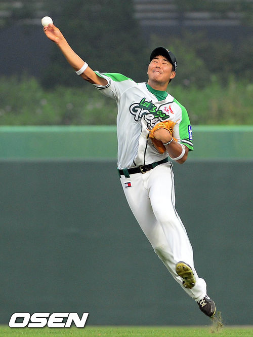 4일 오후 인천 문학구장에서 열린 '2013 한국야쿠르트 세븐 프로야구' SK 와이번스와 두산 베어스의 경기 4회초 1사 1루 손시헌의 뜬공을 잡은 한동민이 1루로 송구하고 있다. 1주자 이원석은 세이프.