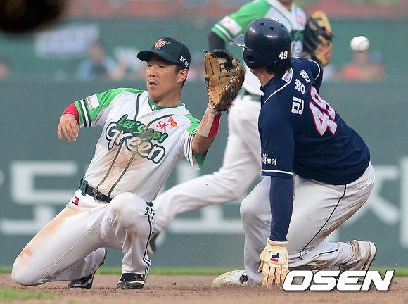 4일 오후 인천 문학구장에서 열린 '2013 한국야쿠르트 세븐 프로야구' SK 와이번스와 두산 베어스의 경기 5회초 1사 1루 임재철 타석, 1루주자 민병헌이 도루에 성공하고 있다.