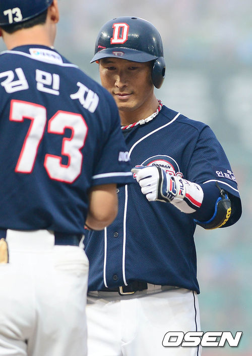 4일 오후 인천 문학구장에서 열린 '2013 한국야쿠르트 세븐 프로야구' SK 와이번스와 두산 베어스의 경기 5회초 1사 2루 임재철이 1타점 적시타를 친 후 김민재 코치와 하이파이브를 하고 있다.