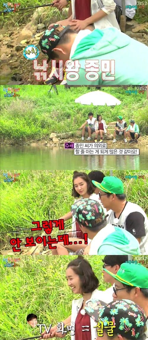 이날 아침 식사를 마친 수애와 이수근, 김종민, 성시경은 강가에서 낚시를 즐겼다. 특히 김종민은 작은 참붕어를 낚아 수애에 선물했고, 이에 수애는 "종민씨가 의외로 할 줄 아는 게 되게 많은 것 같다"고 칭찬했다.