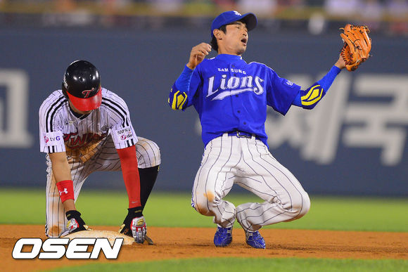 4일 오후 서울 잠실구장에서 열린 2013 한국야쿠르트 세븐 프로야구 LG 트윈스와 삼성 라이온즈의 경기,6회말 1사 1루 삼성 강명구 유격수가 LG 1루주자 이대형에게 도루 허용한 후 아쉬워하고 있다