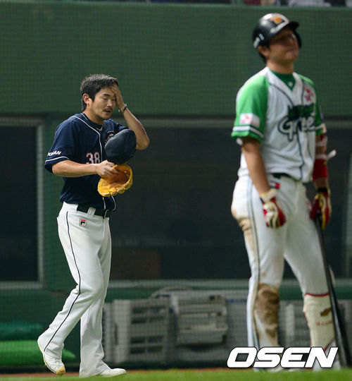 4일 오후 인천 문학구장에서 열린 '2013 한국야쿠르트 세븐 프로야구' SK 와이번스와 두산 베어스의 경기 7회말 2사 1,2루 조동화에게 중전안타를 내준 노경은이 땀을 닦고 있다.