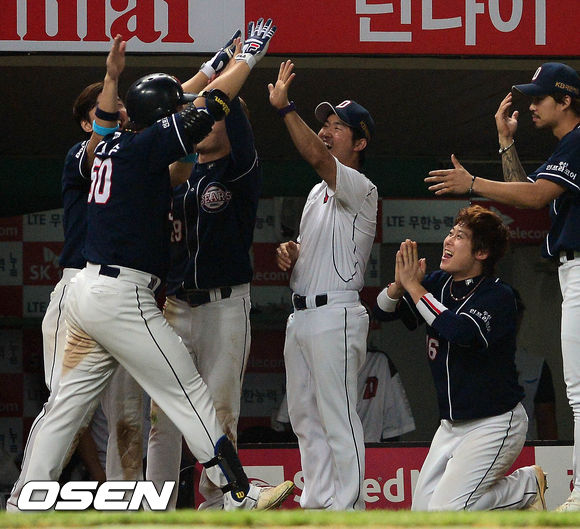 4일 오후 인천 문학구장에서 열린 '2013 한국야쿠르트 세븐 프로야구' SK 와이번스와 두산 베어스의 경기 9회초 1사 1루 김현수가 투런포를 치고 덕아웃에서 동료들과 하이파이브를 하고 있다.