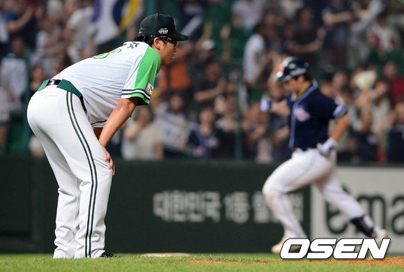 4일 오후 인천 문학구장에서 열린 '2013 한국야쿠르트 세븐 프로야구' SK 와이번스와 두산 베어스의 경기 9회초 1사 1루 김현수에게 투런포를 내준 전유수가 허탈한 표정을 짓고 있다.