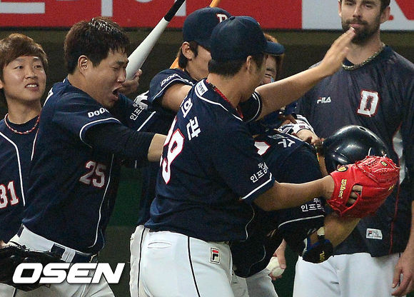 4일 오후 인천 문학구장에서 열린 '2013 한국야쿠르트 세븐 프로야구' SK 와이번스와 두산 베어스의 경기 9회초 1사 1루 김현수가 투런포를 치고 덕아웃에서 동료들의 축하를 받고 있다.