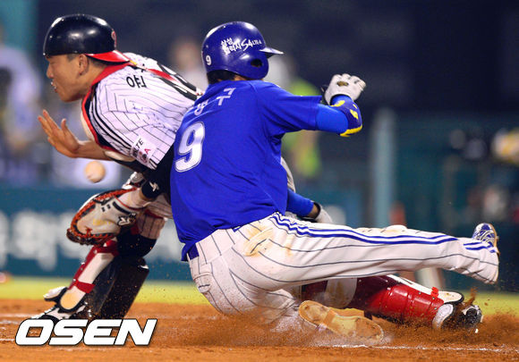4일 오후 서울 잠실구장에서 열린 2013 한국야쿠르트 세븐 프로야구 LG 트윈스와 삼성 라이온즈의 경기,8회초 1사 만루 삼성 우동균의 2타점 적시타때 2루 주자 강명구가 홈쇄도해 세이프 되고 있다.