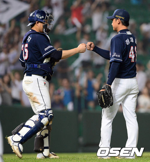 4일 오후 인천 문학구장에서 열린 '2013 한국야쿠르트 세븐 프로야구' SK 와이번스와 두산 베어스의 경기 종료 후 양의지와 정재훈이 하이파이브를 하고 있다.
