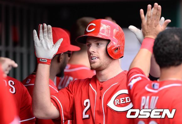 5일(이하 한국시간) 미국 오하이오주 신시내티에 위치한 그레이트 아메리칸 볼파크에서 열린 2013 메이저리그 신시내티 레즈와 세인트루이스 카디널스의 경기, 2회말 2사 1루에서 신시내티 코자트가 좌월 투런 홈런을 치고 덕아웃에서 동료들과 환호하고 있다.