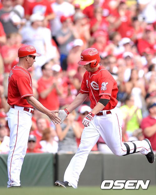 5일(이하 한국시간) 미국 오하이오주 신시내티에 위치한 그레이트 아메리칸 볼파크에서 열린 2013 메이저리그 신시내티 레즈와 세인트루이스 카디널스의 경기, 2회말 2사 1루에서 신시내티 코자트가 좌월 투런 홈런을 치고 그라운드를 돌고 있다.